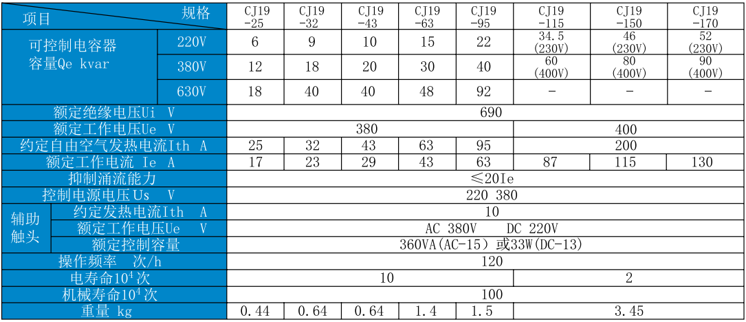 CJ19系列切换电容器接触器(以下简称接触器)主要用于50Hz(或60Hz)、额定工作电压至400V的电力系统中,作为功率因数补偿装置中可控电容器至90Kvar的自愈式低压并联电容器的投入和切除之用。接触器带有抑制涌流装置,能有效的减小合闸涌流对电容器的冲击和抑制开断时的过电压。